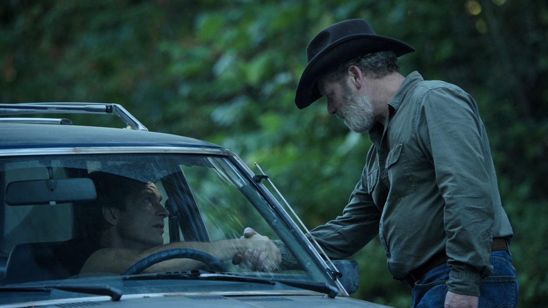 With increasingly tense music filling our ears, we watch as the Byrde’s wrap and hide the $50 million in cash that was delivered to them earlier in that day in the wall’s of a cabin at the Blue Cat Lodge. Simultaneously, Russ and Boyd are boating across the lake with guns, tape, rope, and other supplies necessary to kidnap and kill a man in their possession. During this sequence, Marty goes over to the kitchen to get his family some dinner only to see Ruth drive by. They exchange a glance, but the scene continues on.
